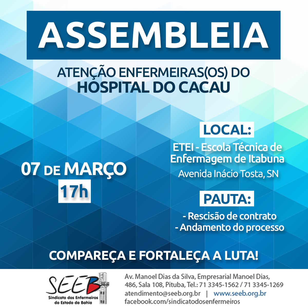 Assembleia com enfermeiras(os) do Hospital do Cacau acontecerá dia 07/03